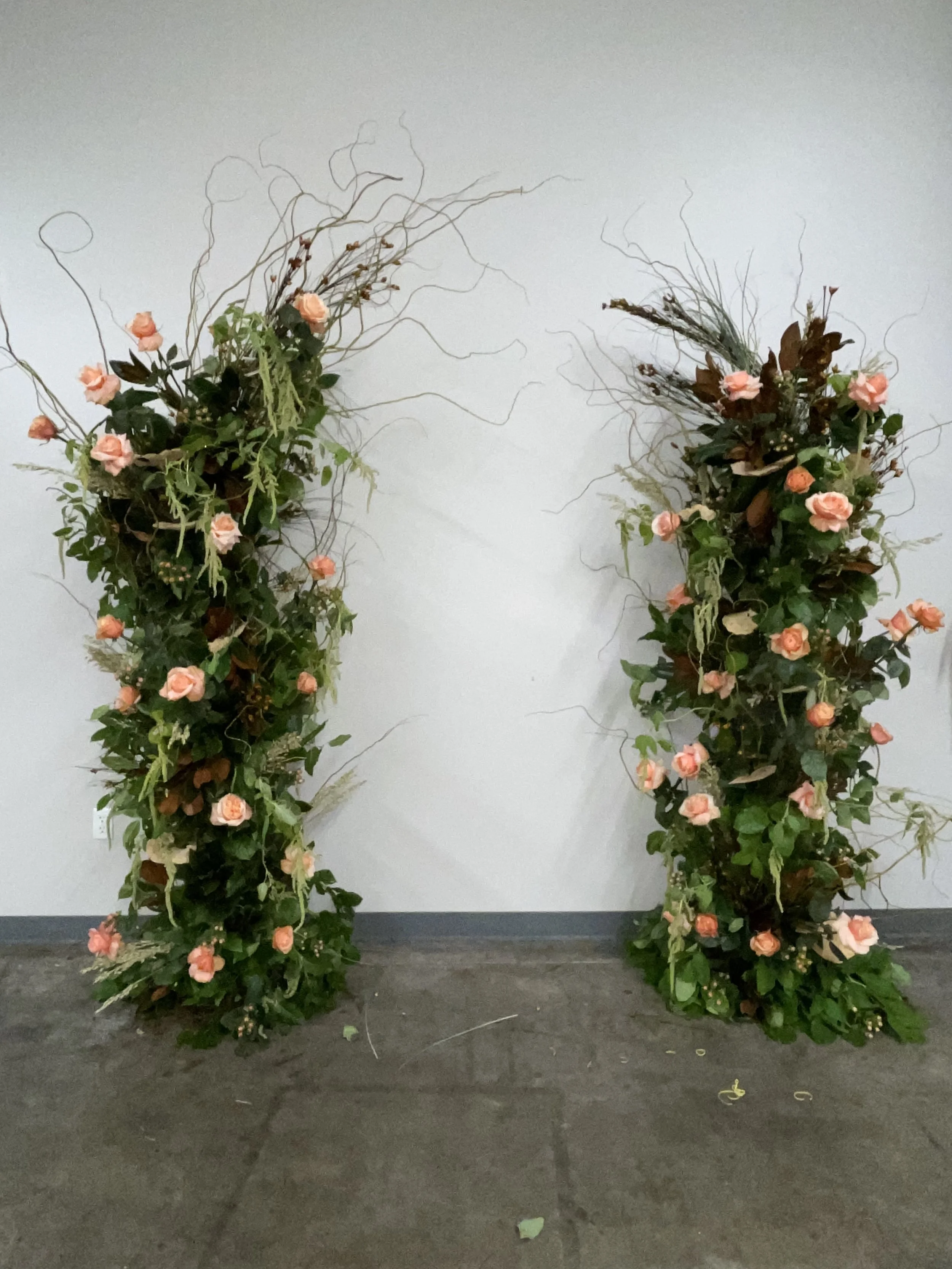 6ft metal arch poles. What was challenging about this piece is that no chicken wire or foam was used so we had to get really creative to add the greenery, flowers, mushrooms, etc. With creativity and Jenny’s (the instructor’s) technique, it was sturdy and worked out perfectly in the end. When we noticed one piece appearing to be fuller than the other, we split our team up and had everyone switch sides. It was a quick idea that created balance and harmony within the two pieces. The theme we were going for was fall warm tones, earthy, mystic, supernatural-like.